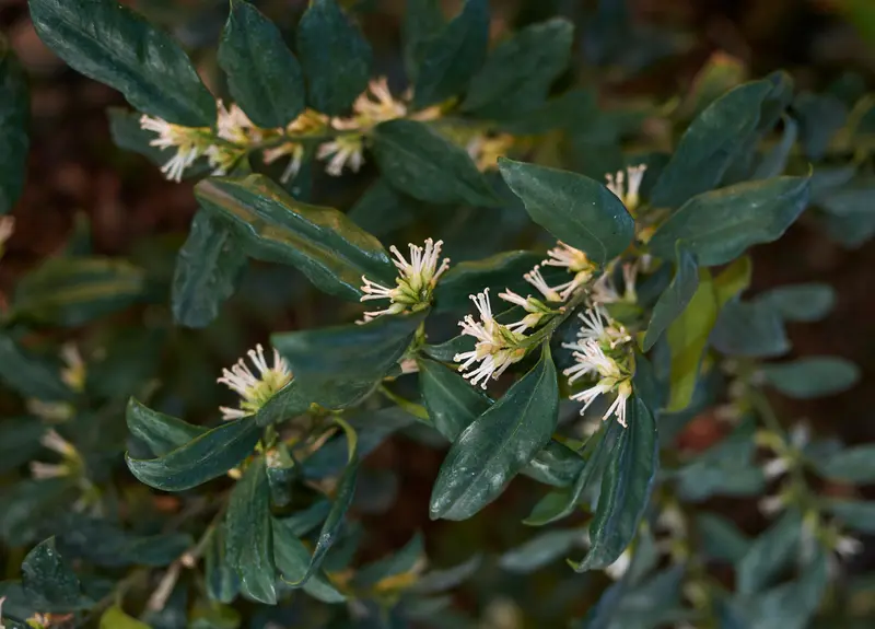 Visitors to Glendoick in winter who visit our greenhouse in the plant area will soon be met with the sweet smell of Christmas Box. This popular evergreen small shrub or ground cover has a mass of small white sweetly scented flowers opening in midwinter, on a spreading. It has occasional black fruit in summer and is useful for its tolerance of dry shade. Plant it near the door of the house and you'll smell it every time you pass.